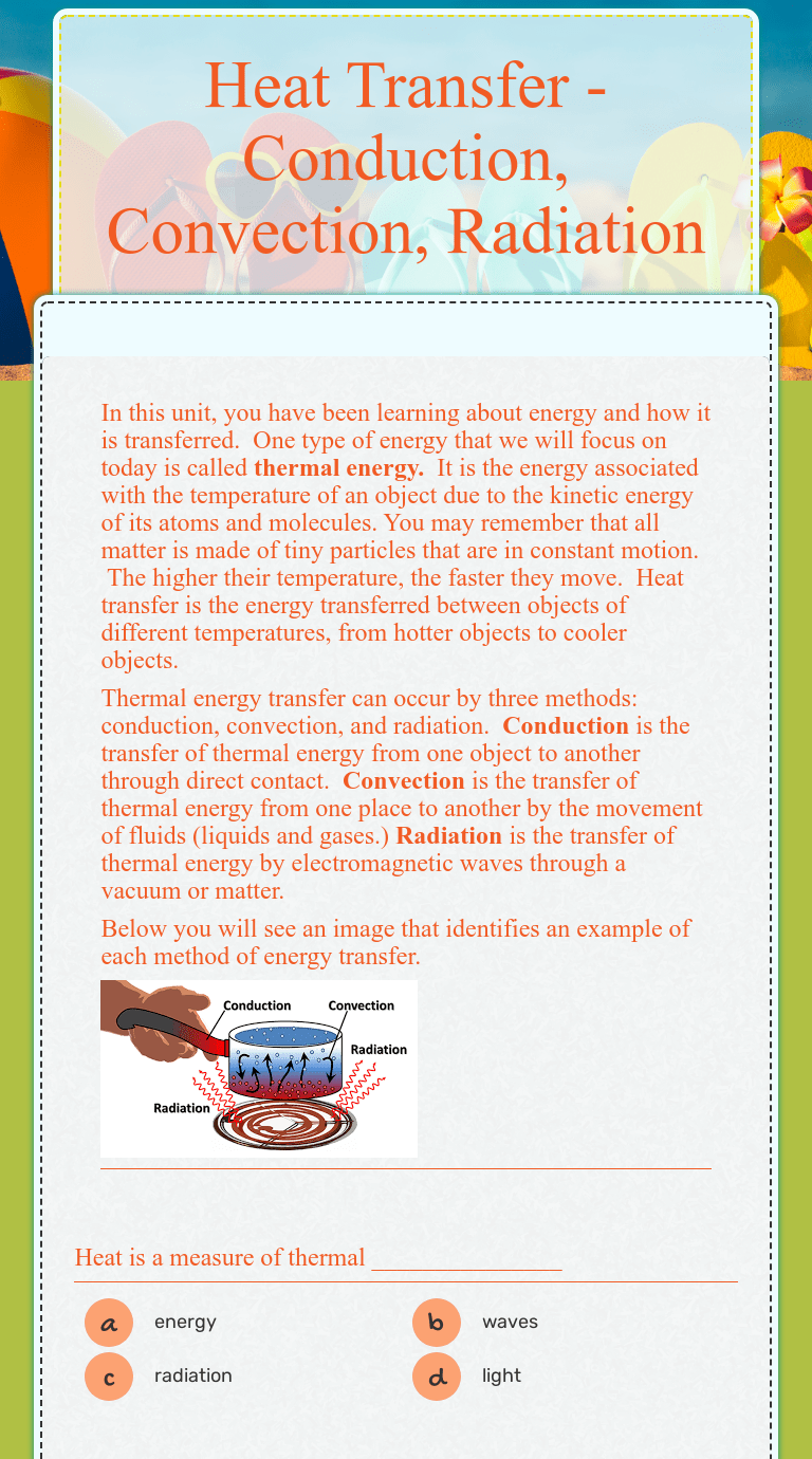 Heat transfer worksheet answers luxury conduction convection radiation worksheet . The method of heat transfer that occurs when particles move through a fluid is called . Fill heat transfer image sort answer key, edit online. Heat is transferred through from the pan to . Some may have two possible answers.